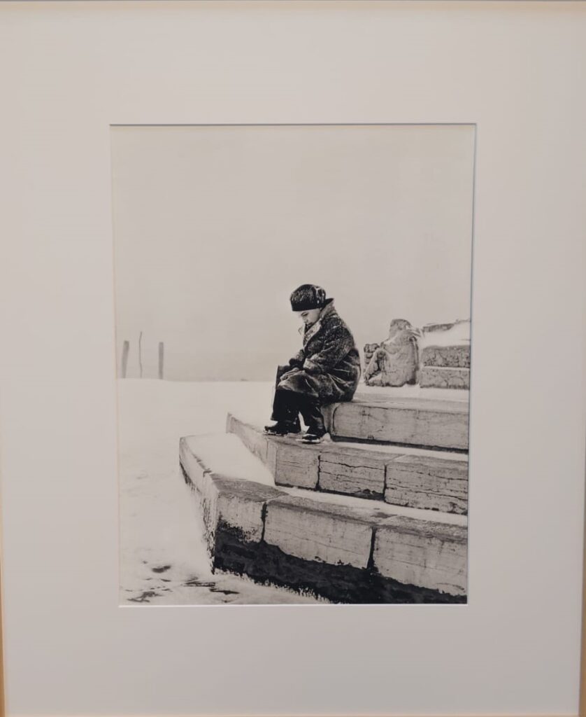 Una foto del 1956 ritrae un bambino vestito con un cappotto e un berretto spruzzati di neve che, seduto su dei gradoni poco sopra un canale d’acqua sorride con la testa china guardando il piccolo mondo intorno a lui. Un mondo fatto anche dei suoi piccoli scarponi imbiancati e di un freddo che sembra intirizzire e stupire alla stessa maniera. Le foto raccontano attimi di vita catturati, racchiusi nella memoria e consegnati al nostro sguardo curioso.