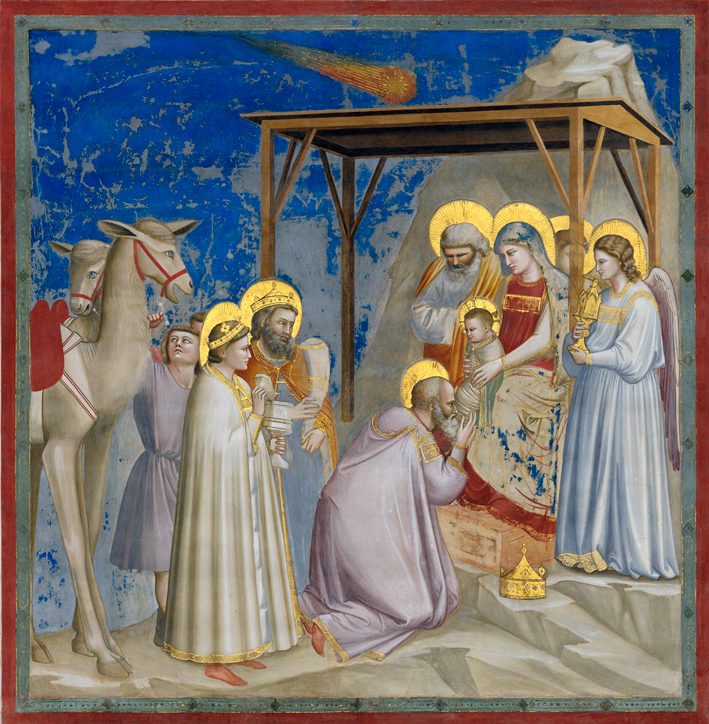 Giotto vissuto a cavallo dei secoli Duecento e Trecento, nella compostezza dei gesti, negli sguardi concentrati dei presenti e nell’eleganza sobria delle vesti che possiamo ammirare nell’Adorazione dei Magi, ha saputo anche rendere il sentimento del dono. Potremmo o vorremo entrare in quella scena per condividere quel semplice e naturale incanto. La stella cometa in alto ci riporta a quel tempo, nel 1301, quando la stella di Halley fu vista attraversare il cielo da Giotto. Pochi anni dopo egli affrescava a Padova la Cappella degli Scrovegni.