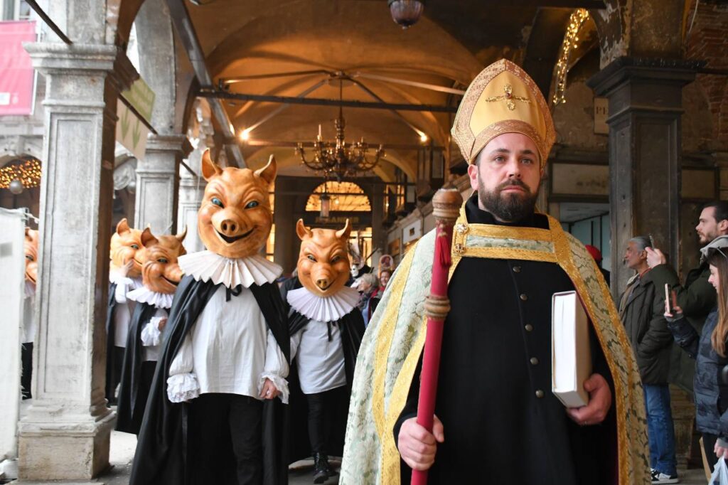 A narrare la vicenda la maschera di Pantalone, accompagnata dalla nipote e dalla balia friulana, mentre la delegazione di Aquileia, vestita di mantelli neri con gorgiera e dai mascheroni da Maiale, ha interpretato il Patriarca Ulrico e i dodici feudatari ribelli. Lo storico rito del “sacrificio” dell’animale andato in scena sul palco di Piazza San Marco ha ricordato la vittoria del doge Vitale II Michiel sul patriarca Ulrico di Aquileia e sui suoi dodici feudatari ribelli. Un trionfo ottenuto nel sangue che costò ai traditori un pegno all’epoca salatissimo.