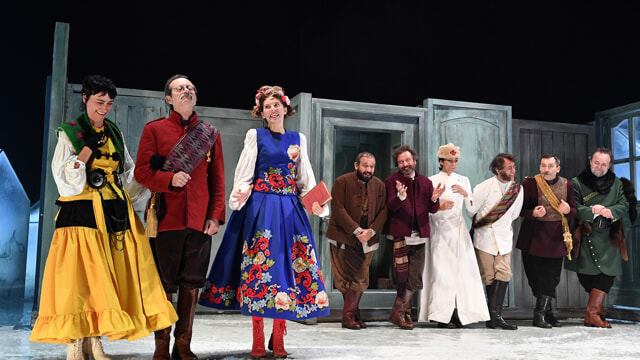 Ne approfitta anche lui e “si fa prestare” dai potenziali corruttori una bella somma di denaro. La beffa viene scoperta dal postino che leggeva tutte le missive come quella del presunto ispettore che scrive proprio a Gogol, raccontandogli, prima di fuggire da quel luogo, l’avventura pazzesca che gli era capitata. La neve cadeva nella bella scenografia di Andrea Belli. Sulla scena ai lati, si delineavano in fila diagonale, isbe piccole e grandi che digradavano in profondità. Le luci e le musiche ritmate ricreavano un tempo e uno spazio che ci faceva sentire nella lontana Siberia. E l’assurdo ci faceva sorridere.