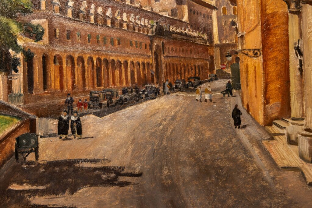 Attraverso l’occhio attento e la mano sicura dell’artista, si ricostruiscono le vicende che dal primo Novecento e per tutto il Ventennio cambiarono per sempre il volto della Capitale: demolizioni radicali, scoperte clamorose, interventi scenografici voluti dal regime fascista. La sua opera non è soltanto testimonianza artistica, ma un archivio prezioso che ci restituisce la complessità di un’epoca in cui, per aprire nuove strade e piazze monumentali, si sacrificavano interi quartieri, chiese e palazzi.