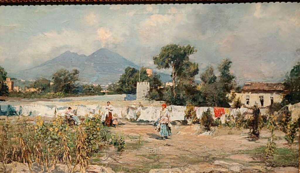 Agli azzurri che hanno rasserenato i nostri occhi fanno da contraltare in un’altra stanza i colori caldi, allo stesso modo, nelle tonalità scure e vivaci, della scuola di Posillipo, movimento nato nel napoletano negli anni Venti del XIX secolo che si caratterizza per un’attenta osservazione della Natura.