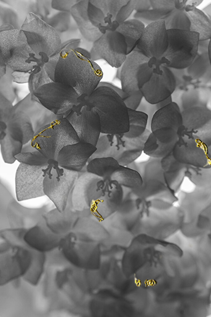 Le foto, come da tratto distintivo di Anna Caterina, sono stampate su chiffon in seta con ricami in Lurex color oro a creare dei piccoli e delicati contrappunti all’interno dell’immagine.