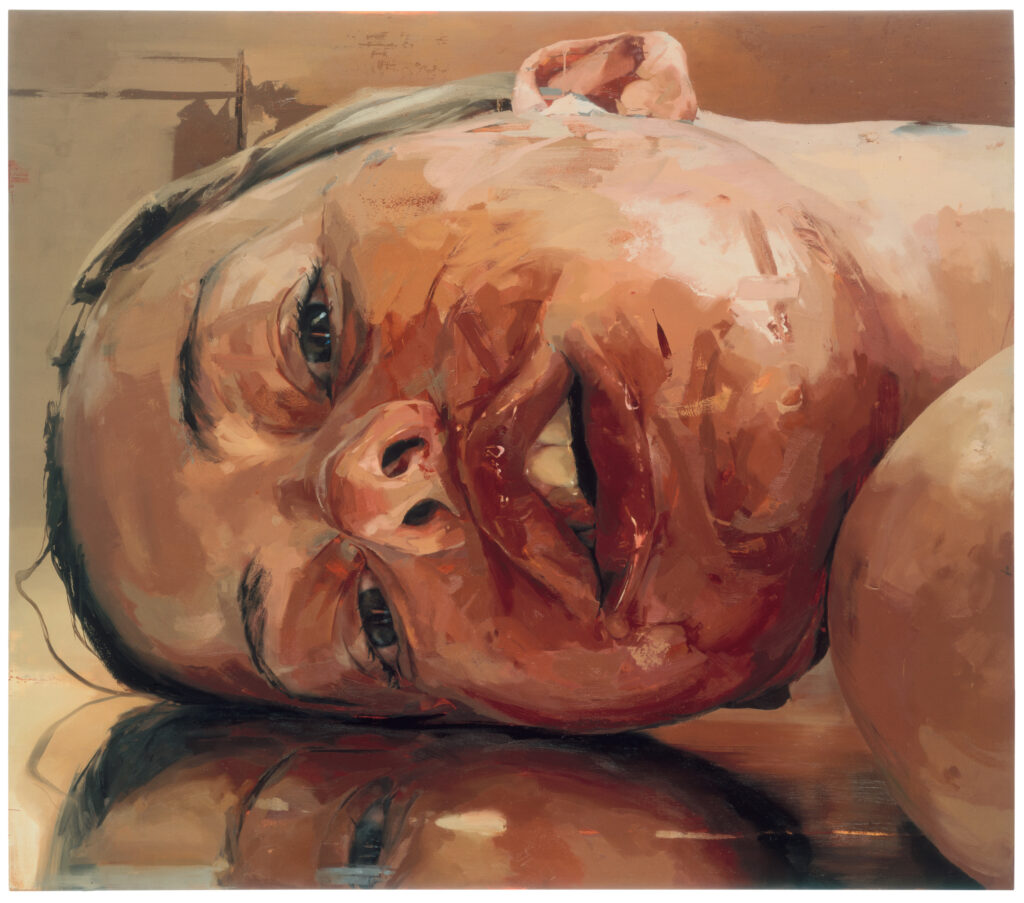 L’arte di Jenny Saville pone al centro della sua ricerca il corpo, spesso quasi grondante di una carnalità rubensiana. La sua è una scelta coraggiosa che mostra la lucentezza delle parti di cui si costruisce la figura umana e al tempo stesso ne estrapola pezzi che in alcuni casi sembrano galleggiare soli nella tela. Un guardare a tutto tondo nelle forme che si espandono e si ingigantiscono quasi a forare la nostra sensibilità abituata, soprattutto negli ’90 quando Jenny Saville comincia a farsi conoscere, ad una perfezione estetica inseguita spesso maniacalmente attraverso i bisturi del chirurgo.
