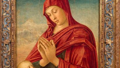 Il morbido ed elegante panneggio del mantello che avvolge la Madonna mentre assorta contempla il piccolo Gesù sembra anch’esso nel suo movimento disegnare