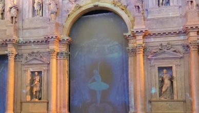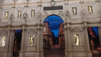 Lo scenario profondo del Teatro Olimpico di Vicenza con le sue scultoree architetture è divenuto il luogo del sacro in Assassinio nella Cattedrale.